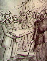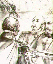 THE TRINITARIANS"When the last one had signed, with the page open on the left, and pointing to the crosses with his right hand, Duarte said, "The cross is not the symbol of suffering; it is the symbol of redemption. under his authority the Trinitaria was formed, with each of the nine members pledged to its continuation, even if only one of them lived, until they had achieved the goal of redeeming the country from Haitian power." José María Serra, "Notes for the History of the Trinitarians Founders of the Dominican Republic," Santo Domingo, 1887.